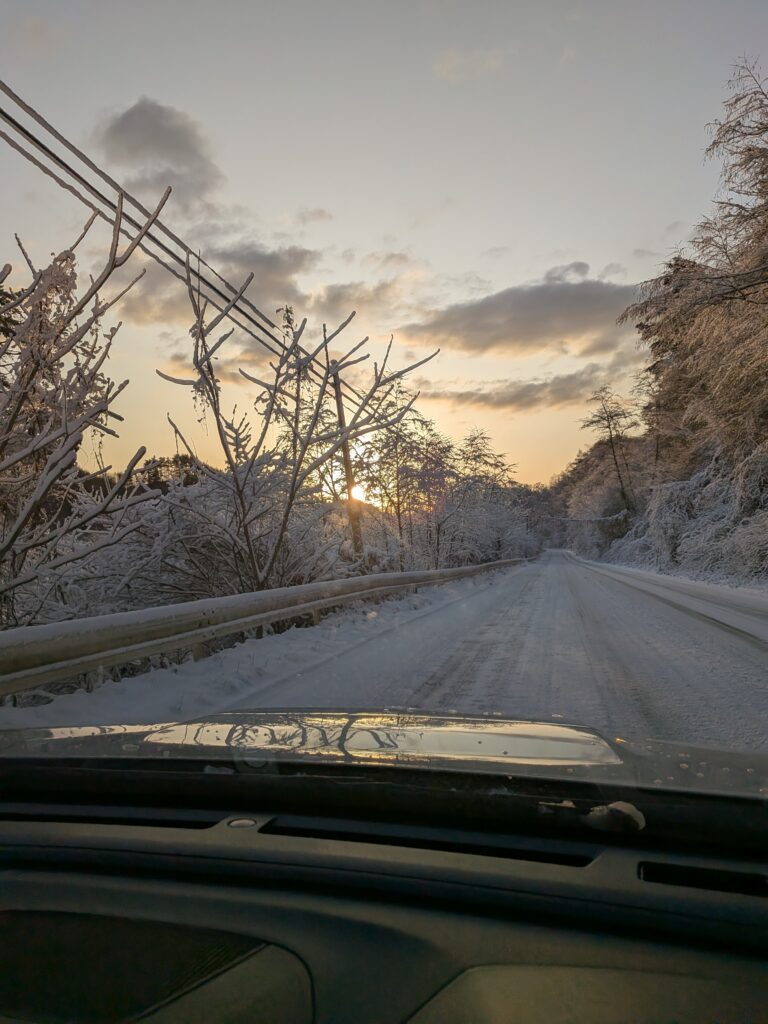 県境を越えると、また雪道。 ガソリンも満タンにしたし、ここからは慎重運転だ。