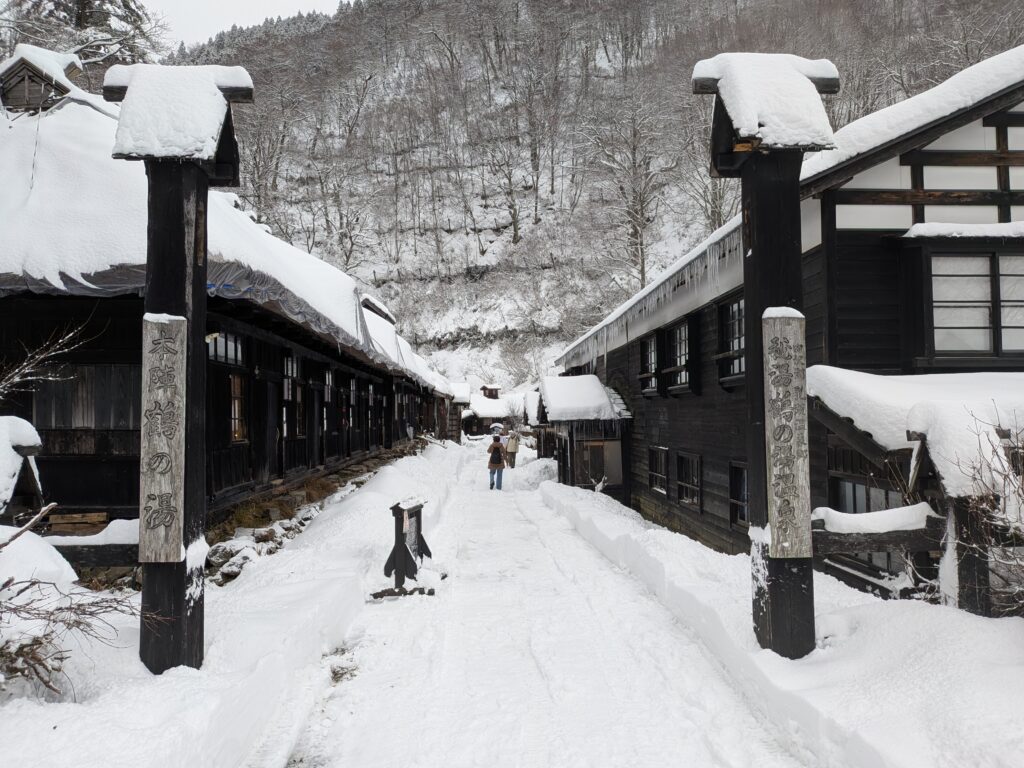 そこから先、路面は完全に凍結。特に鶴の湯へ向かう分かれ道から先は、正直これまでの旅で一番ハードな道だった。